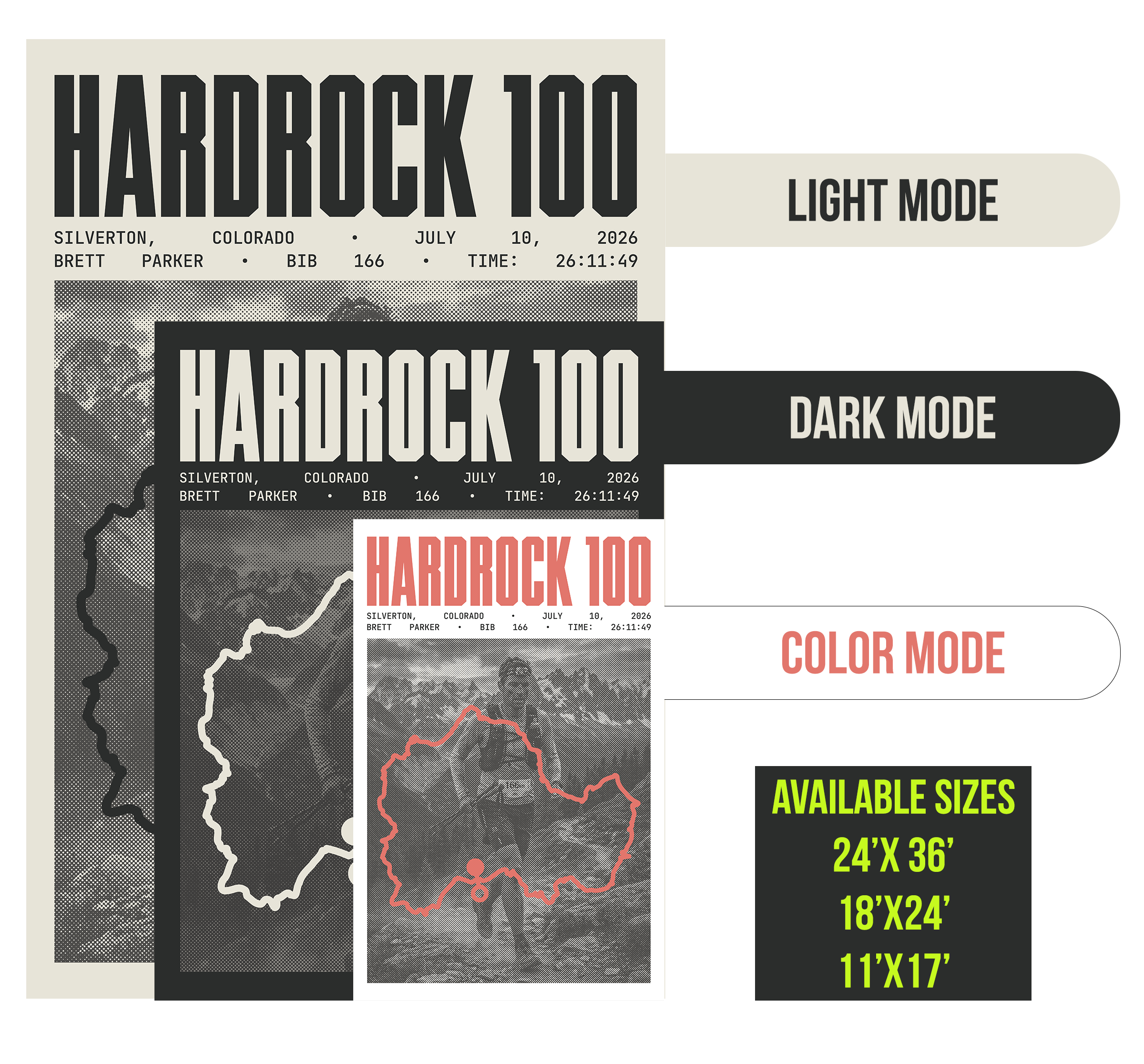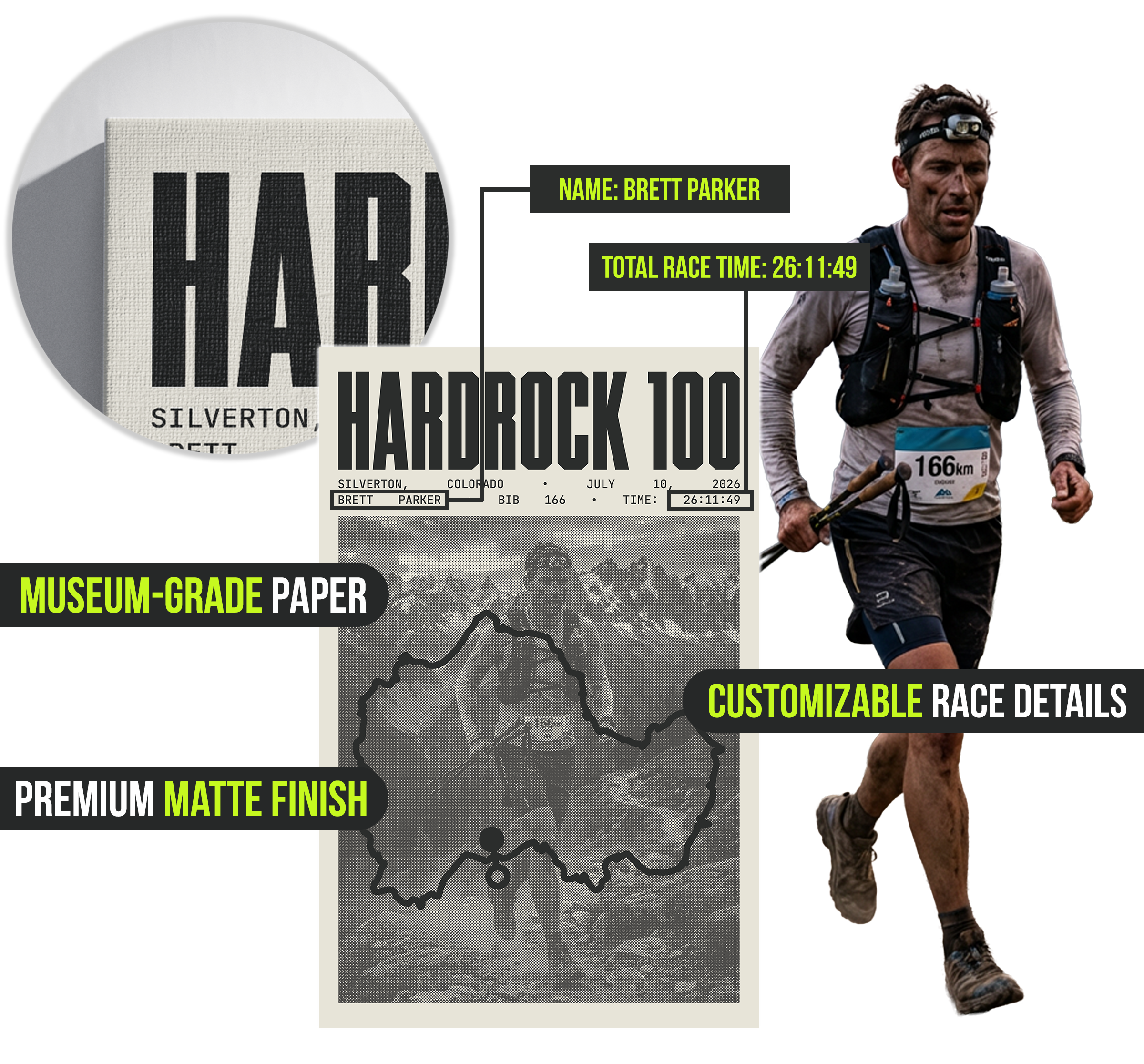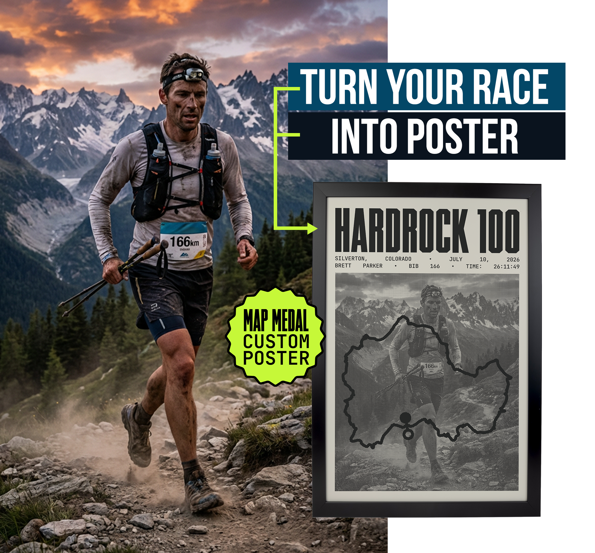 Whether it's a marathon, triathlon, HYROX, or trail run, every race tells a story. Our posters let you customize the details that matter: name, date, time, distance, bib, and more.