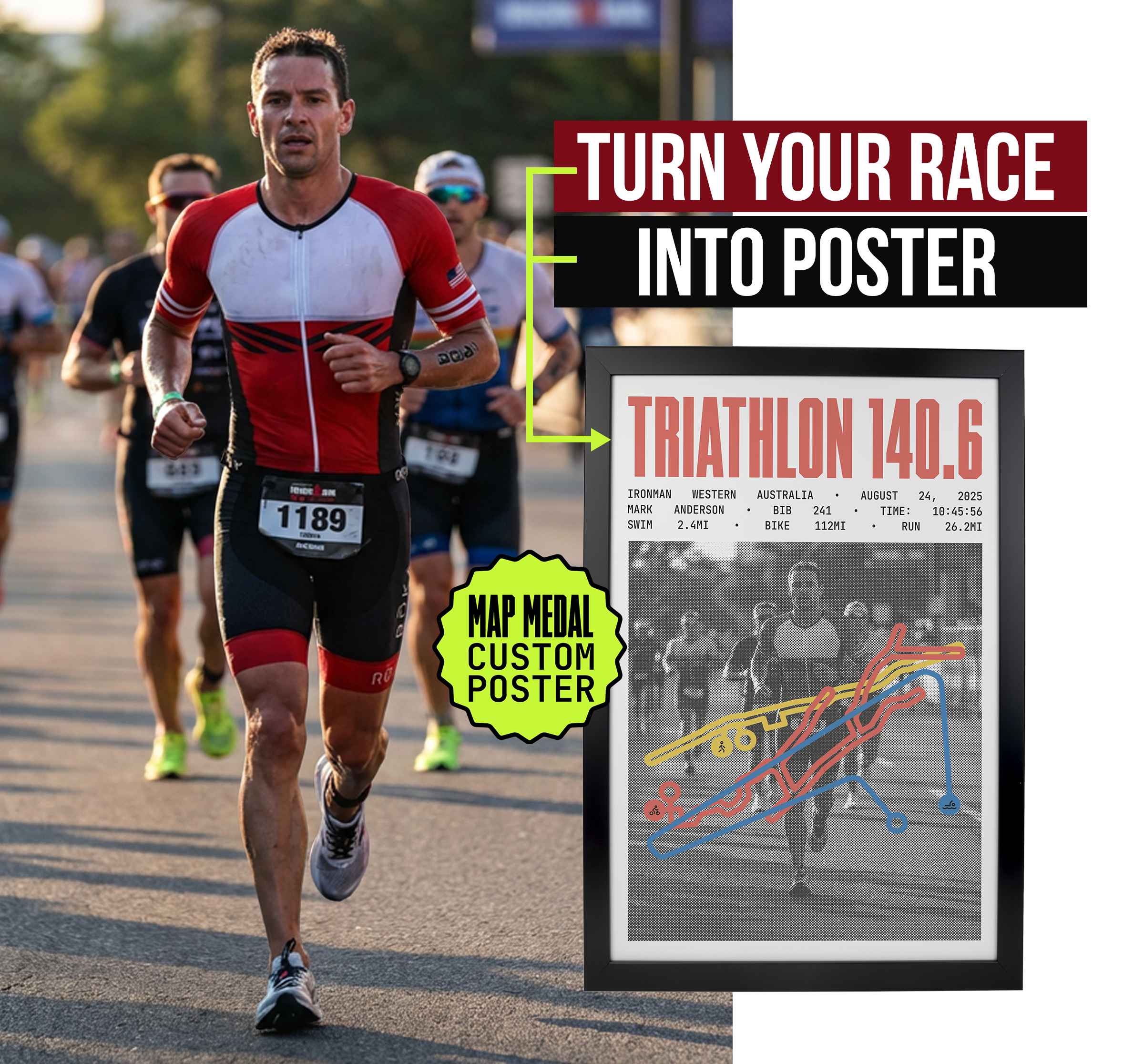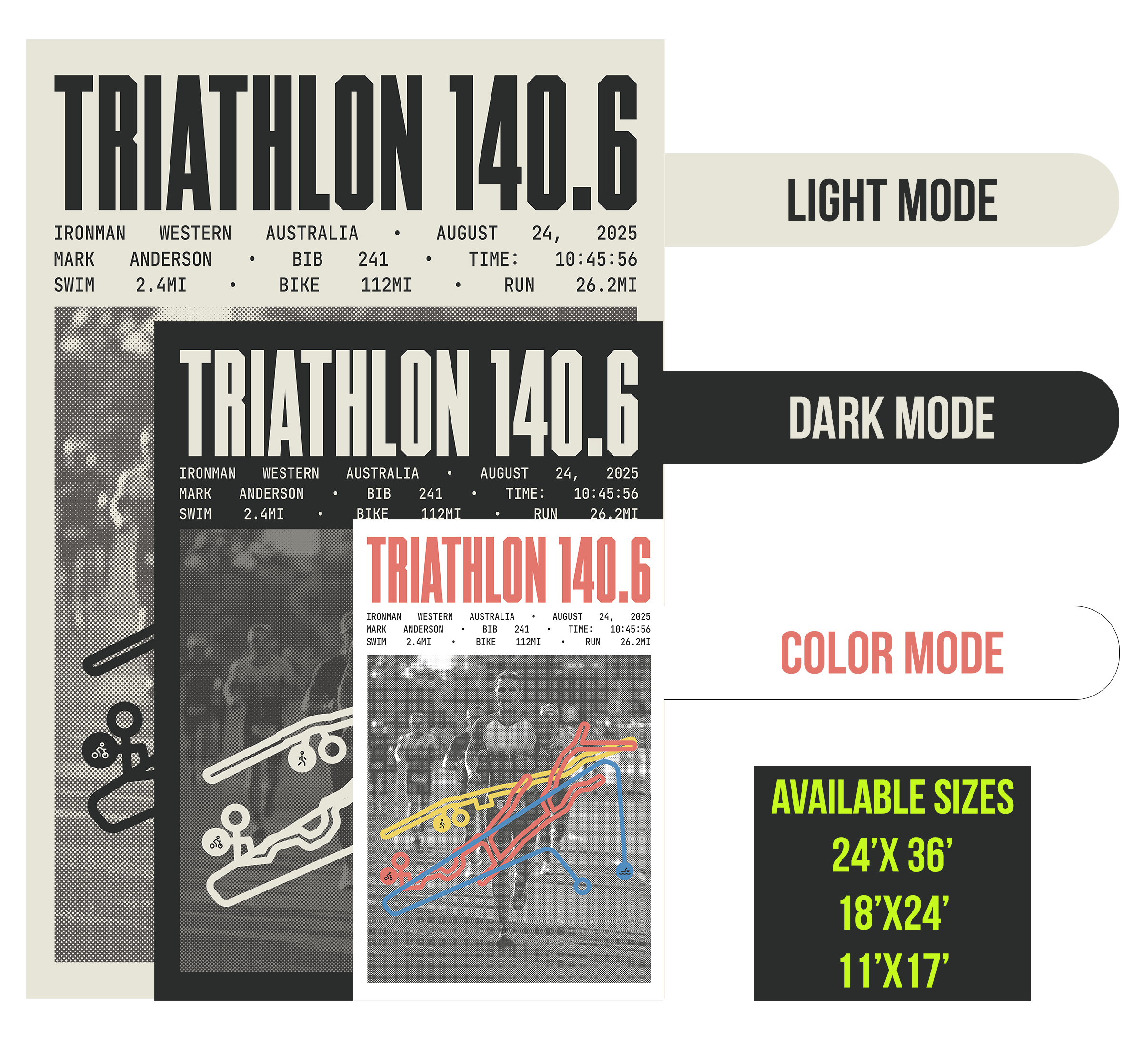 Whether it's a marathon, triathlon, HYROX, or trail run, every race tells a story. Our posters let you customize the details that matter: name, date, time, distance, bib, and more.