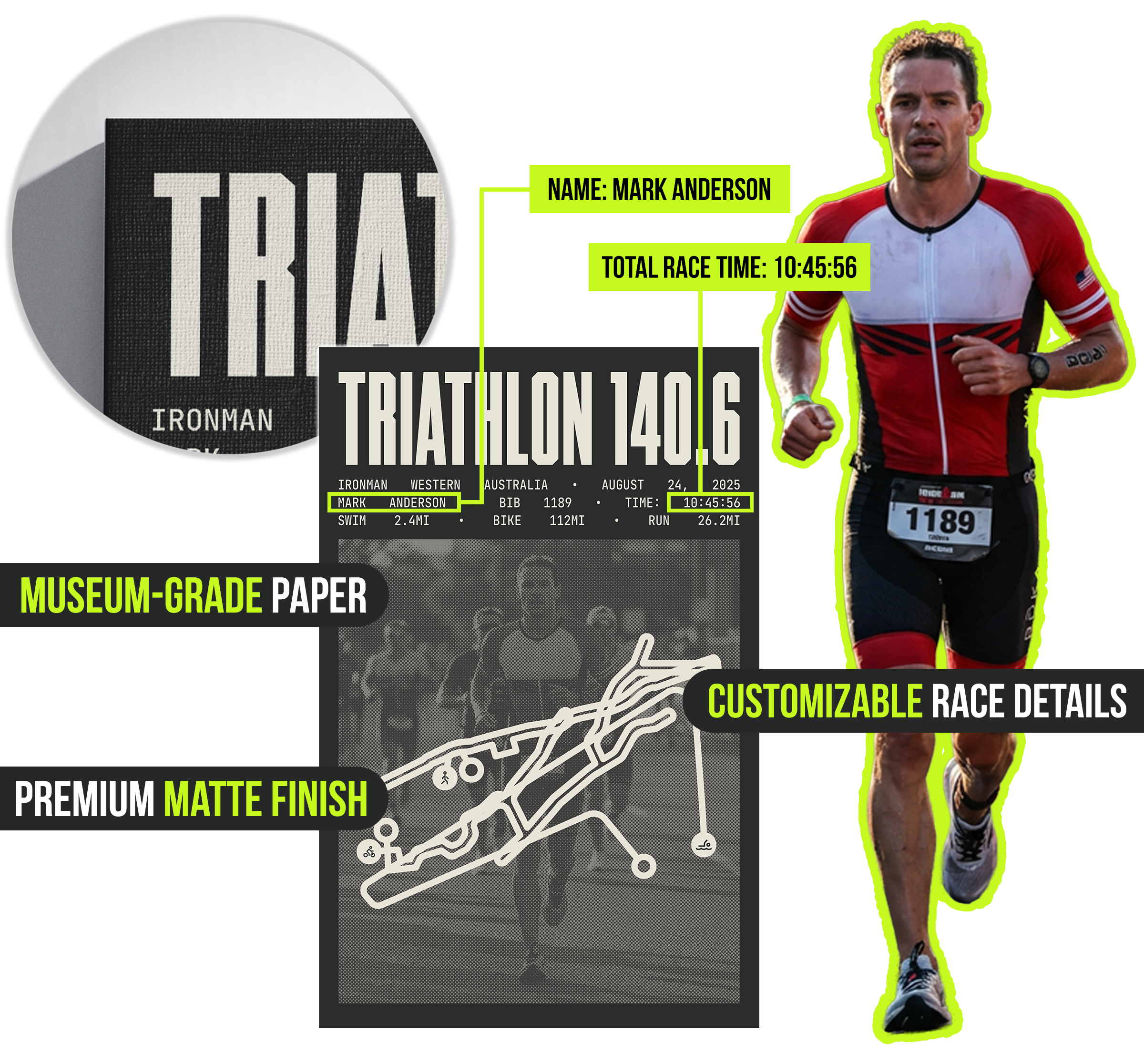- Course Map: A stylized map of your specific Ironman course, serving as a visual reminder of each stroke, stride, and pedal.